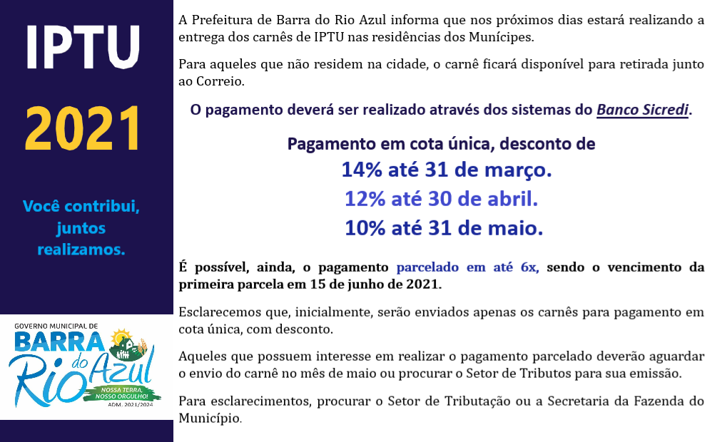 A Prefeitura de Barra do Rio Azul informa que na próxima semana estará realizando a entrega dos carnês de IPTU nas residências dos Munícipes.