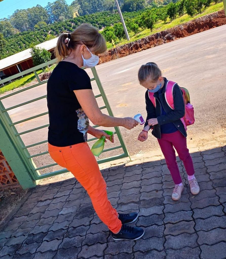 Ao entrar no transporte escolar os alunos recebem álcool em gel 70% para higienização das mãos, os ônibus são higienizados a cada roteiro. E ao chegar na escola é medida a temperatura dos alunos para verificar se estão sem febre.