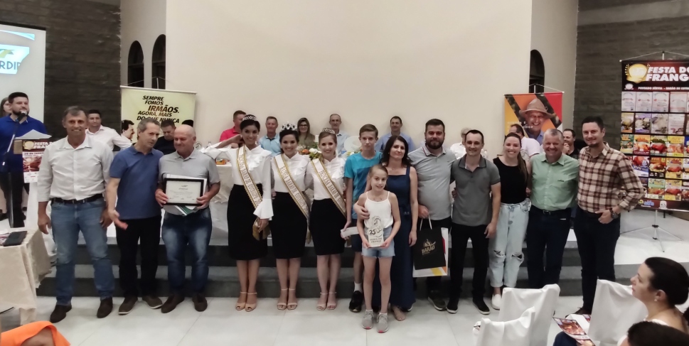 E o 1º lugar é de Barra do Rio Azul, o produtor Ivan Carlos Perondi, da granja Avícola Rio Brasil, associado da Copérdia e que tem os aviários na comunidade do Rio Brasil. Classificado como o melhor avicultor do ano de 2022, com fator de conversão alimentar 1,378; aves alojadas 242.795 aves e entregues 224.786, sendo a assistente técnica, Paloma.